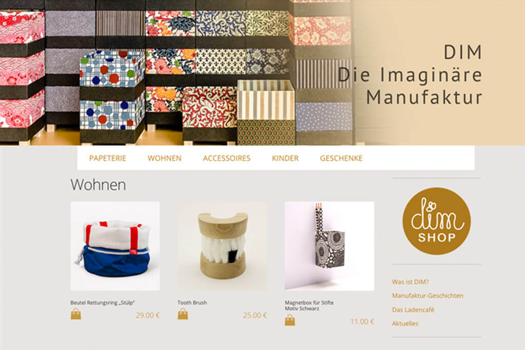 DIM bietet eine außer gewöhnliche Palette von Designprodukten, Utensilien für Küche und Wohnen, Upcycling-Schmuck und Berlin-Souvenirs. Alle Produkte werden in Berlin gestaltet und hergestellt. Im traditionellen Handwerk, gemeinsam von Menschen mit und ohne Behinderung.